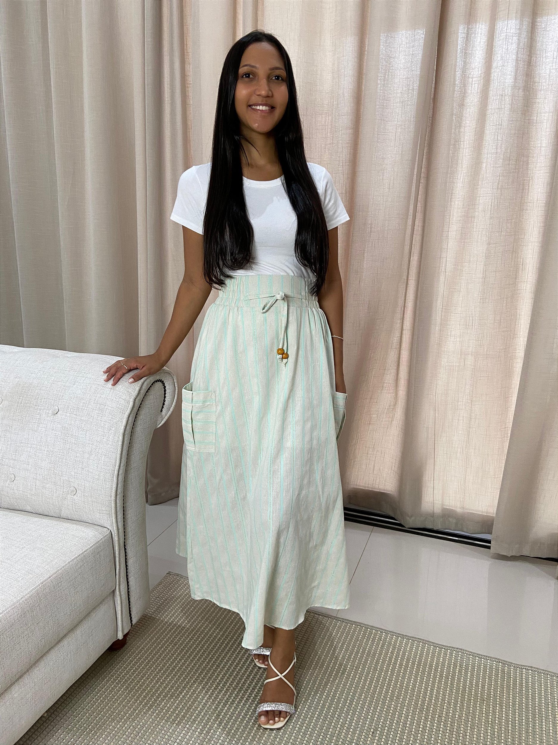 Uma saia longa de linho com bolsos laterais é uma ótima escolha, pois combina elegância e conforto.