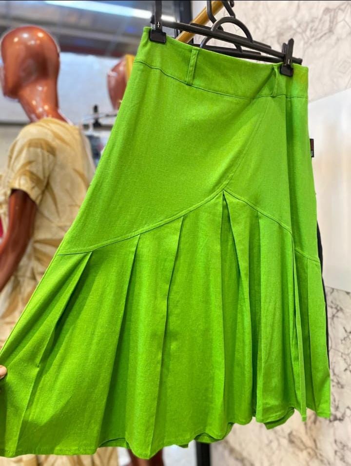 Uma saia de linho verde é uma peça vibrante e fresca, perfeita para looks de verão ou para ocasiões descontraídas. A cor verde traz esperança e um toque de alegria ao visual, enquanto o linho mantém o look leve e arejado.