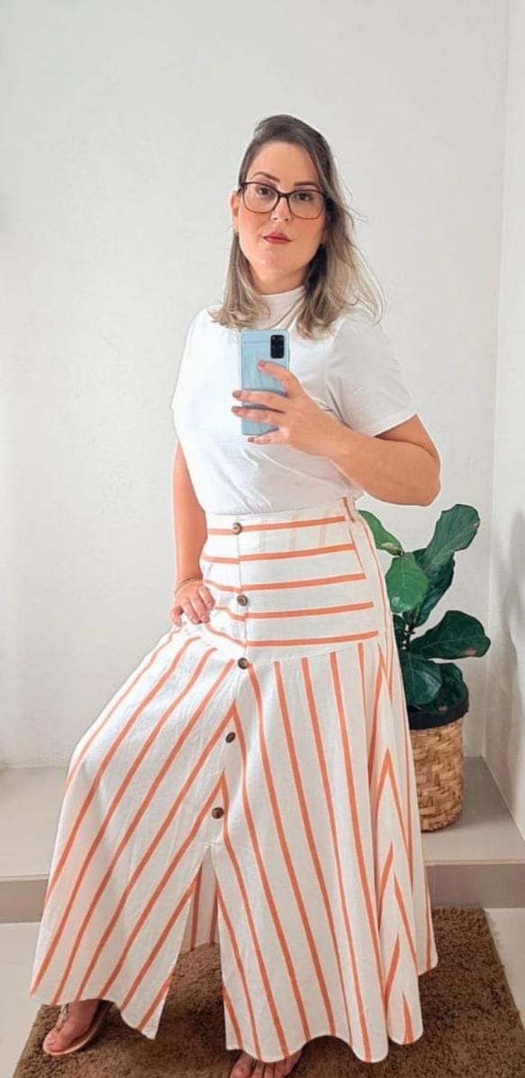Saia Listrada Laranja e Branca com Botões – Estilo e Leveza para Qualquer Ocasião